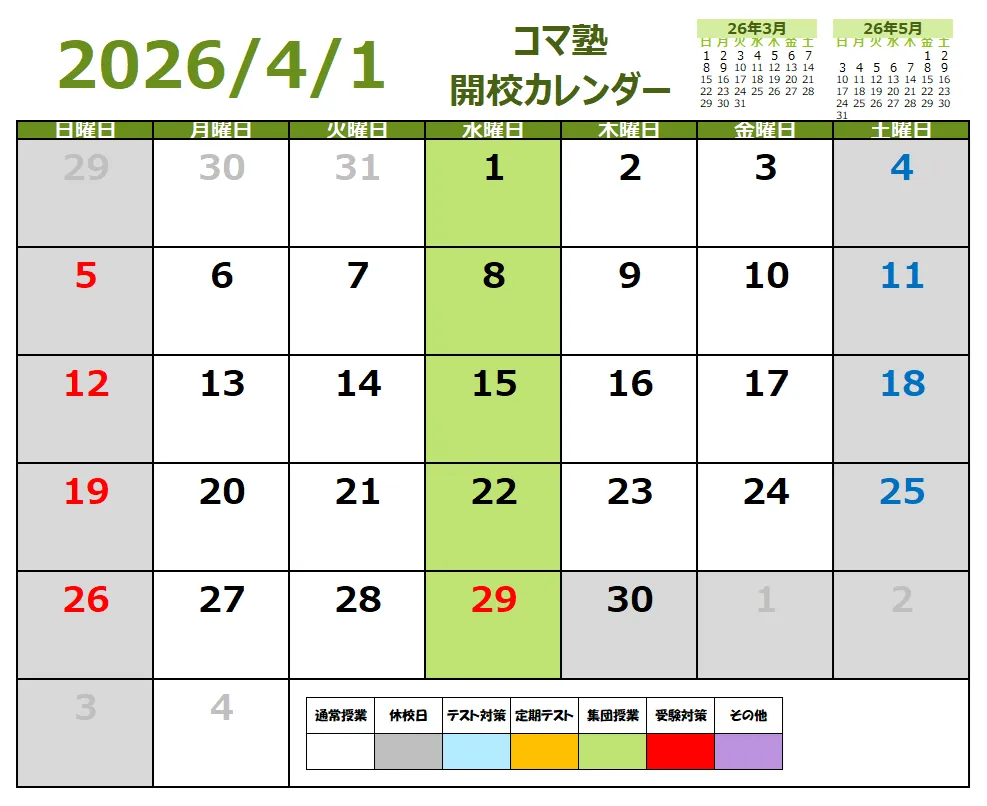 2026年04月開校スケジュール 2026/03/31 2026年04月の開校スケジュールとなります。 コマ塾内部生向けのお知らせとなります。 ※4/30~5/6までG.W.休みとしてお休みとなります。小学生・中学生問わずコマ塾自体がお休みとなりますのでご承知おきください。